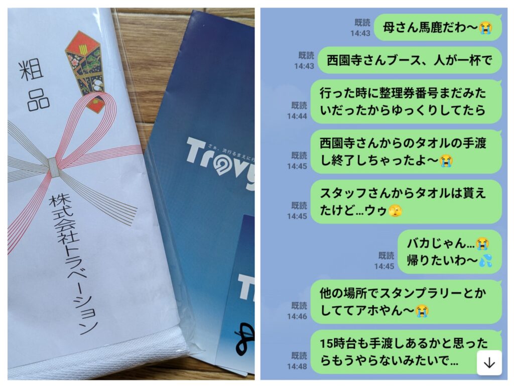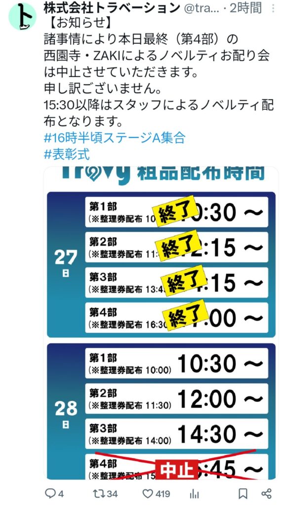 正確には自分の整理券グループの手渡し開始がXでお知らせされてから10分程度で切り上げられてしまいました……。トラベーションブースに戻ったらちょうど西園寺さんとZAKIさんが裏口?に向かうところでした😢後はスタッフさんが渡す事に……。