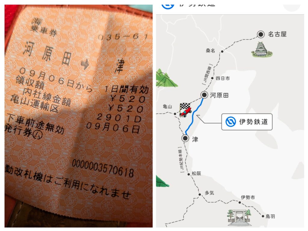 私は乗り物に乗るのは好きですが全然詳しくないのでびっくりしたのですが途中「河原田↔津」間はJRではなく伊勢鉄道になるそうで、この区間は乗り放題切符では通れないということで車掌さんから案内があり、車内で運賃をお支払いしました。